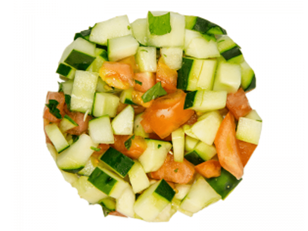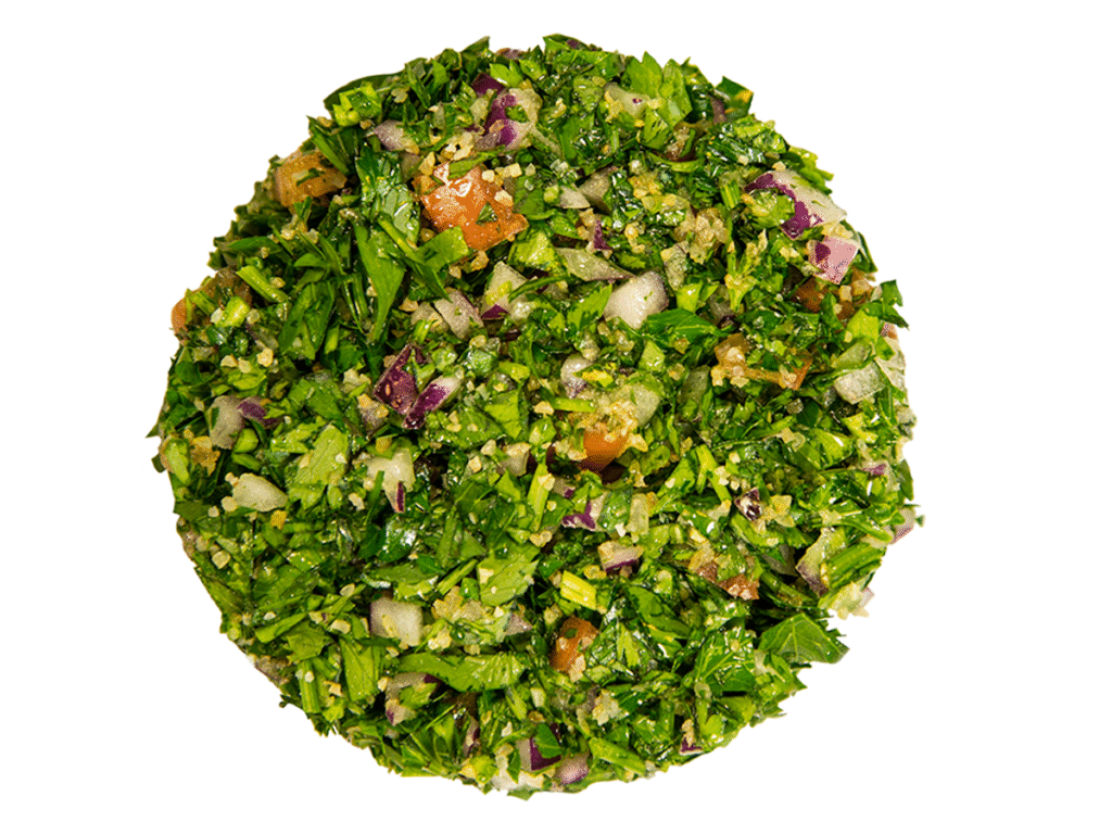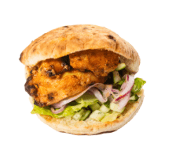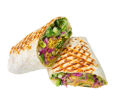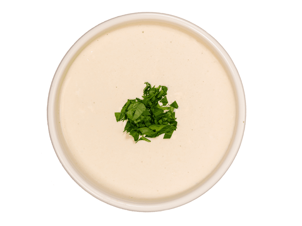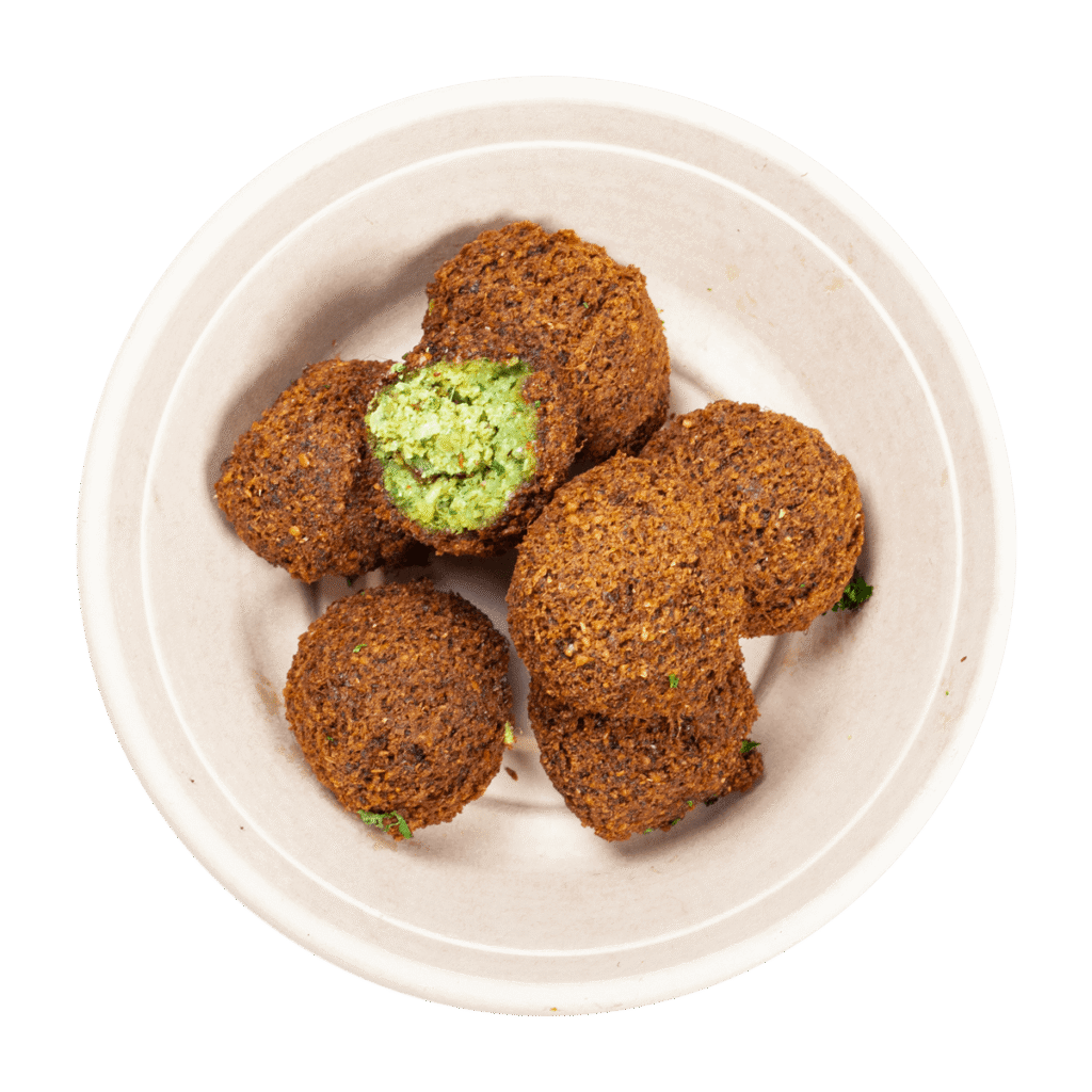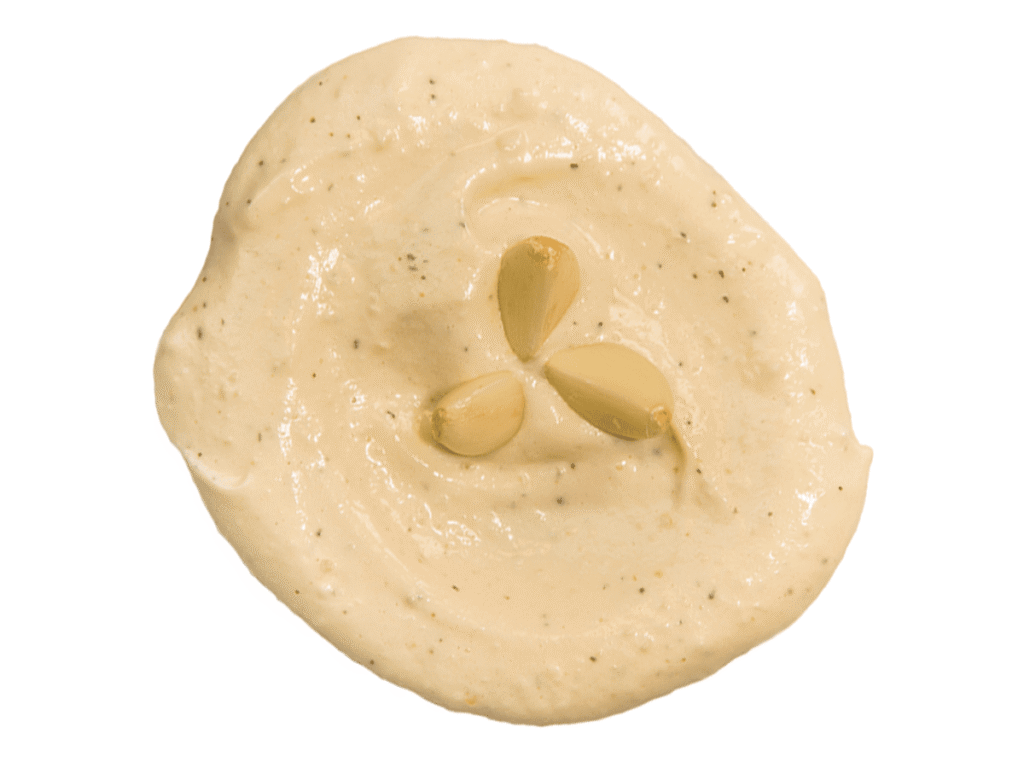 A combination of falafel and shawarma topped with creamy garlic, hummus, pickles, lettuce and tahini sauce.