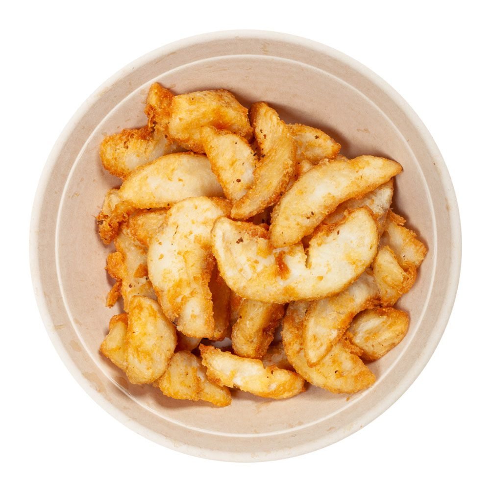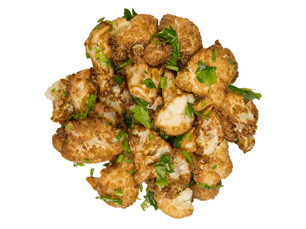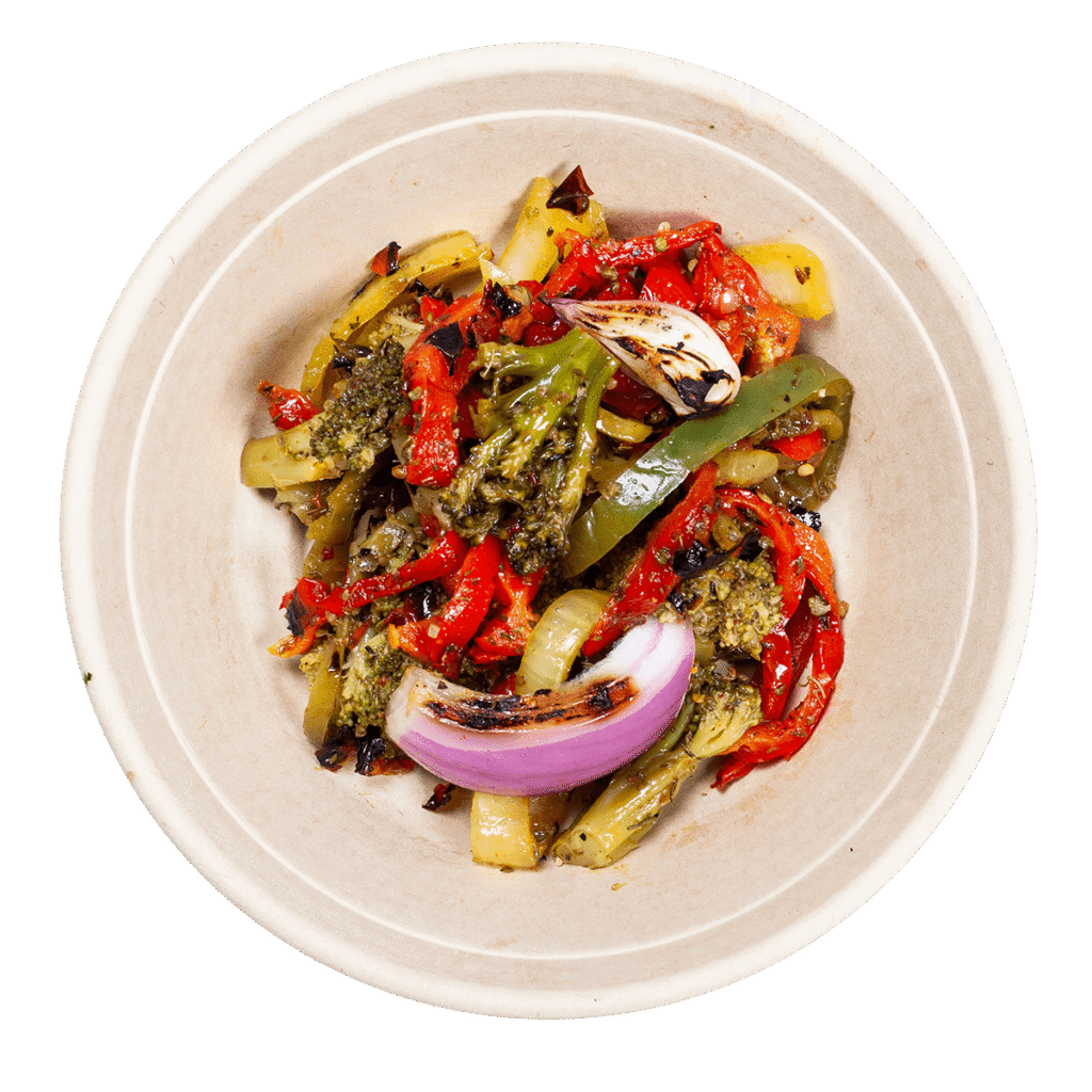 Falafel, rice, hummus baba ganoush, grilled veggies, salad and grape leaves topped with seasoned fries.